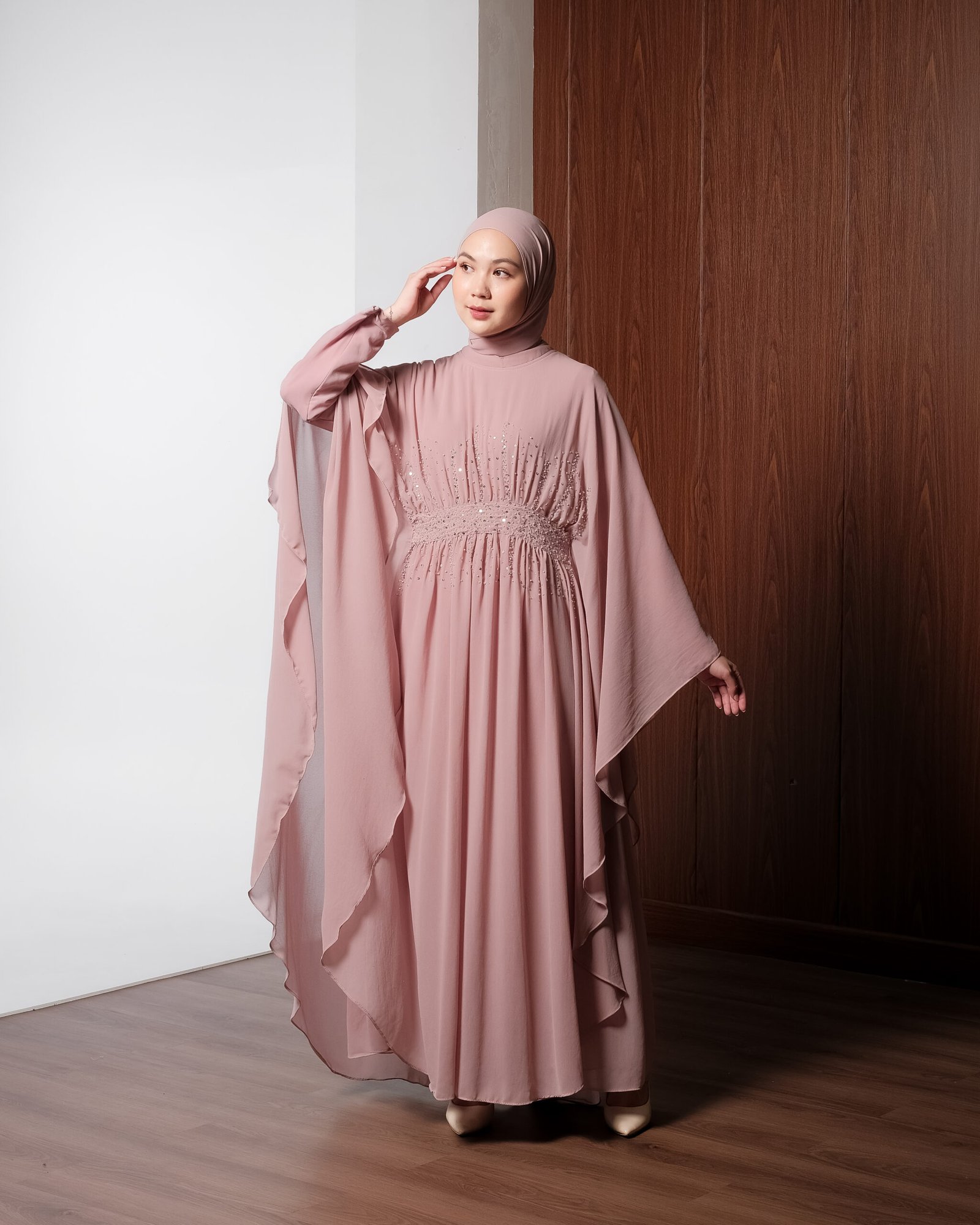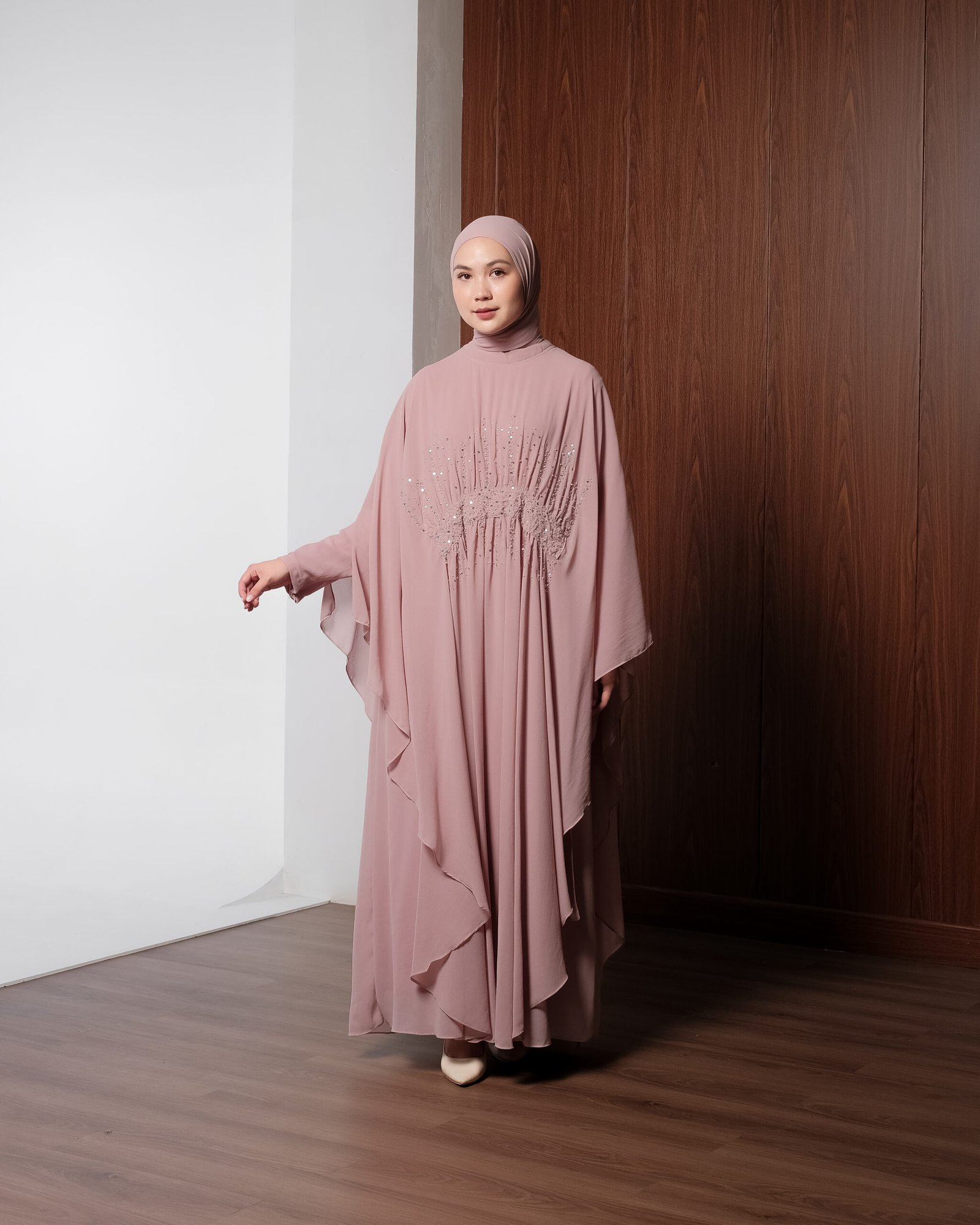 Chyra Kaftan by Rikarifma Official redefines modest luxury with its majestic silhouette and superior craftsmanship. Using the finest cerruti fabric, this piece creates an effortless drape that exudes poise. It is tailored with a comfortable bust circumference of 110 cm and a sweeping length of 140 cm. The design is accentuated by luminous sequin accents (payet) that trace a path of light, offering a regal charm for your special celebrations.