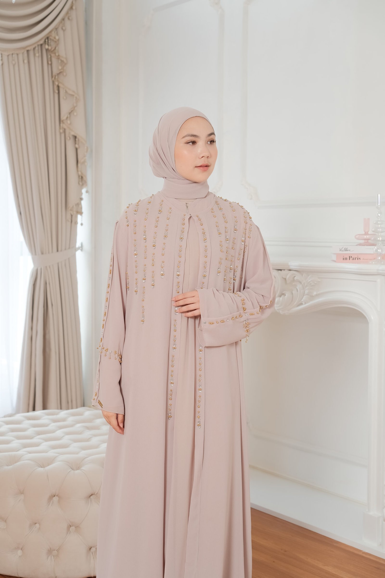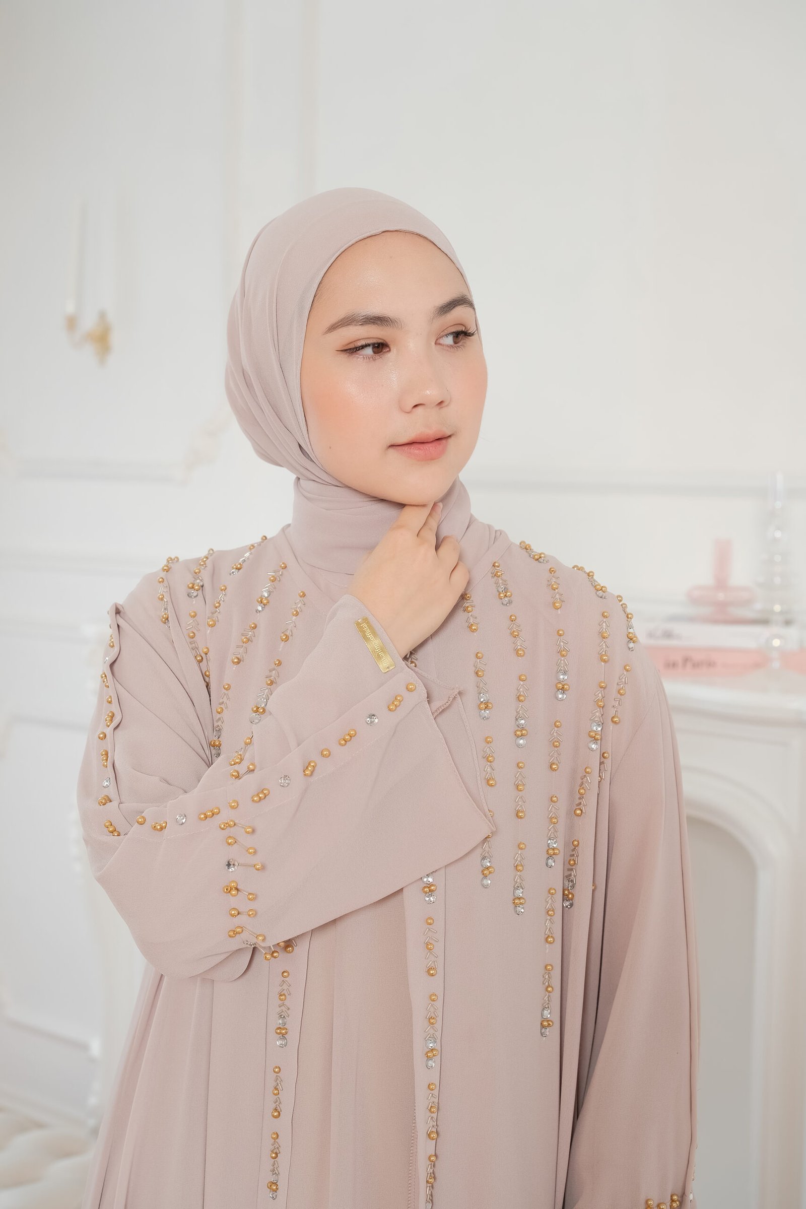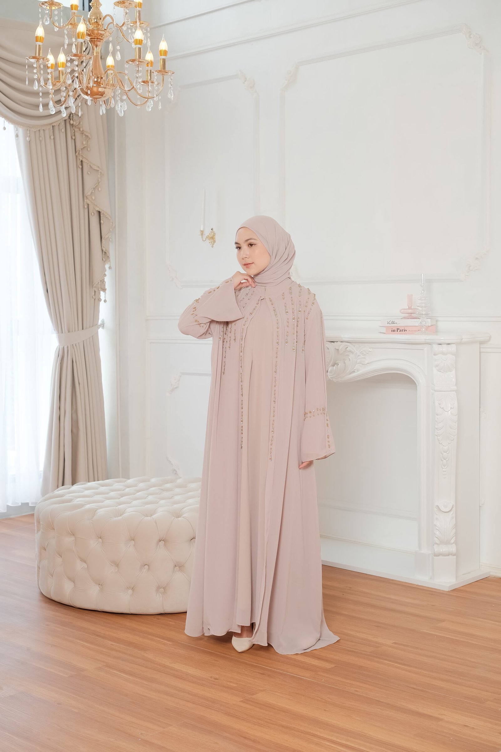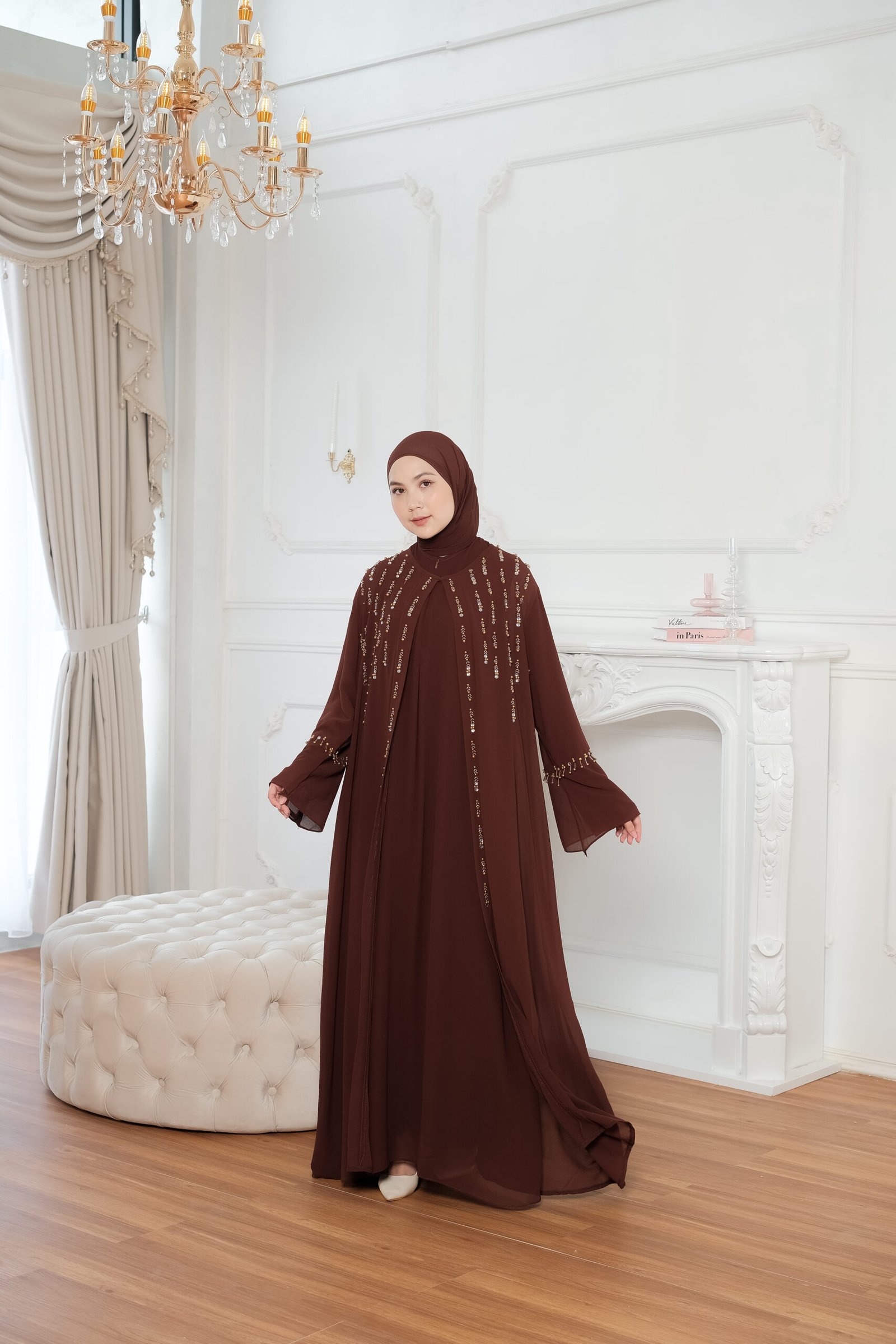 Kalila Abaya embodies timeless sophistication, made from premium cerruti fabric that ensures a flowy silhouette. The dimensions are set at a comfortable bust circumference of 110 cm and a length of 140 cm. The design is elevated by captivating sequins that are strategically placed to create a subtle yet stunning sparkle, making the abaya truly stand out.