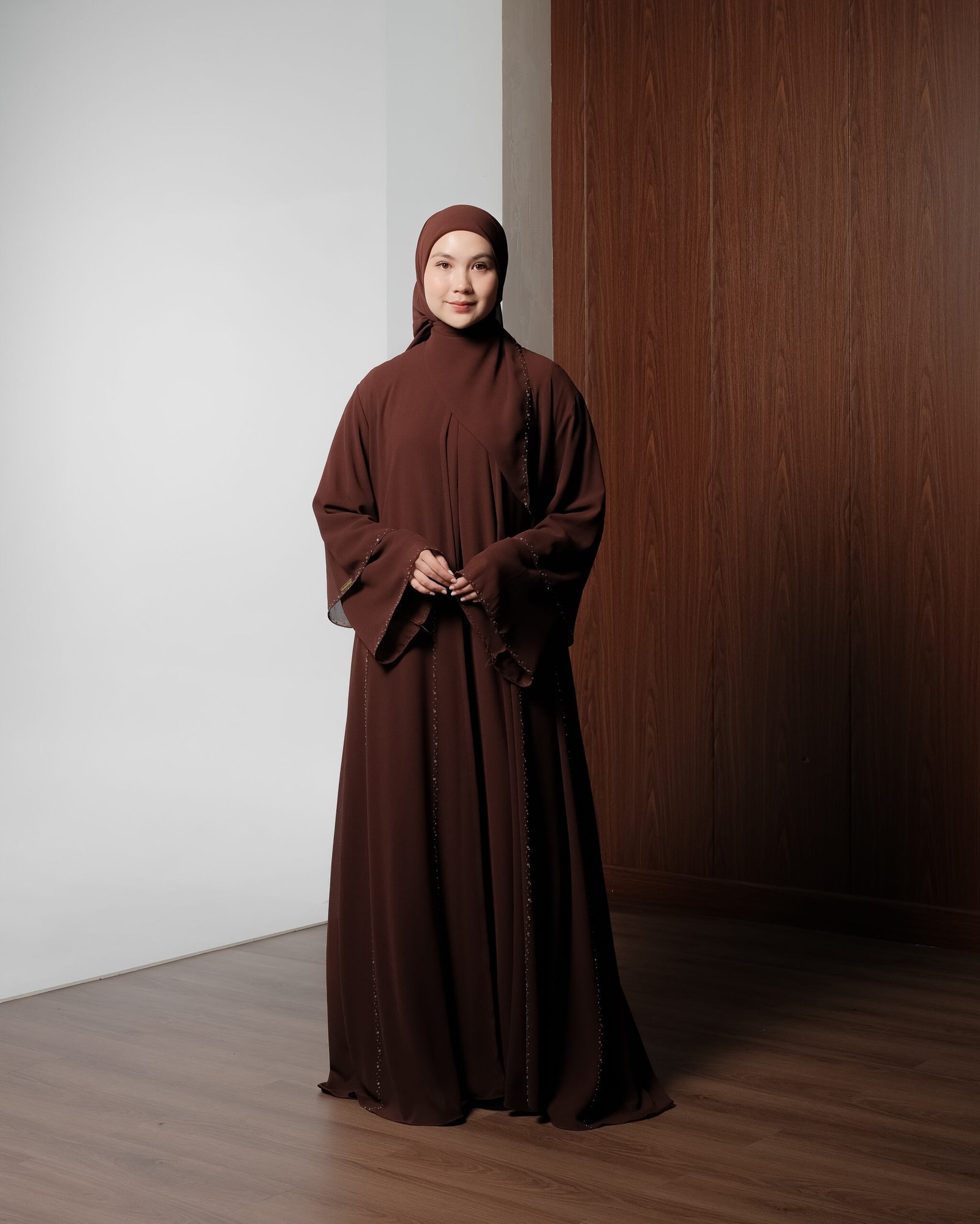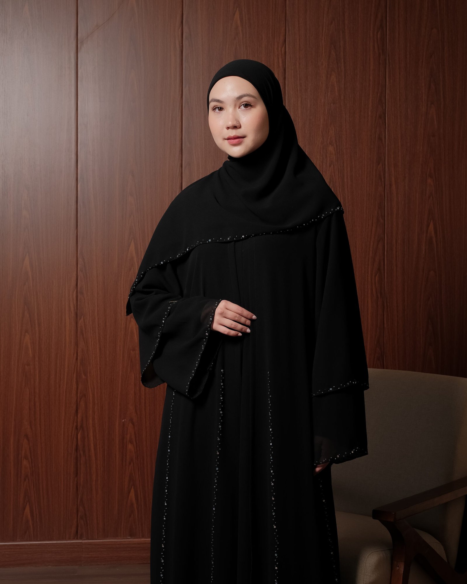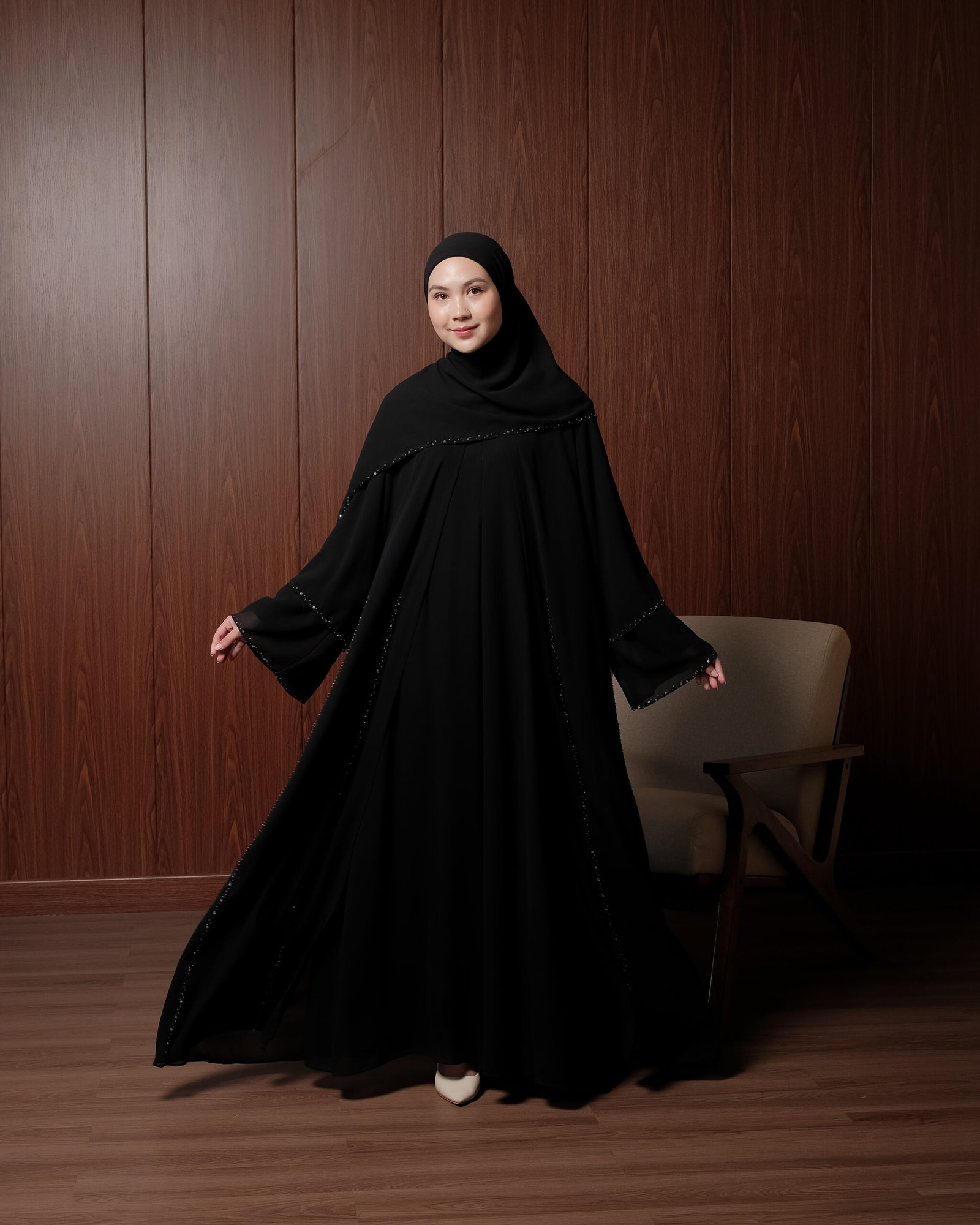 Lubna Abaya is an elegant garment crafted from Cerruty (Premium Synthetic Chiffon) with a generous fit (Bust 110 cm and Length 140 cm), exquisitely detailed with attractive, sparkling sequin embellishments.